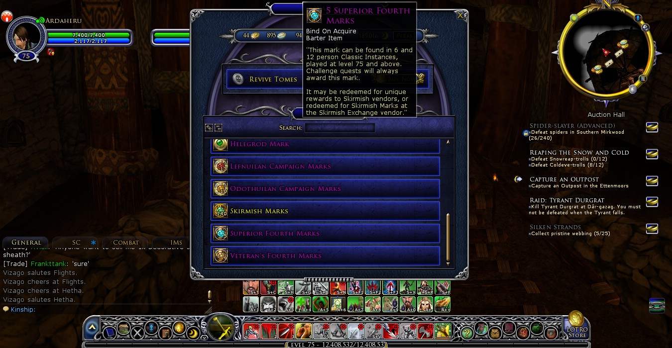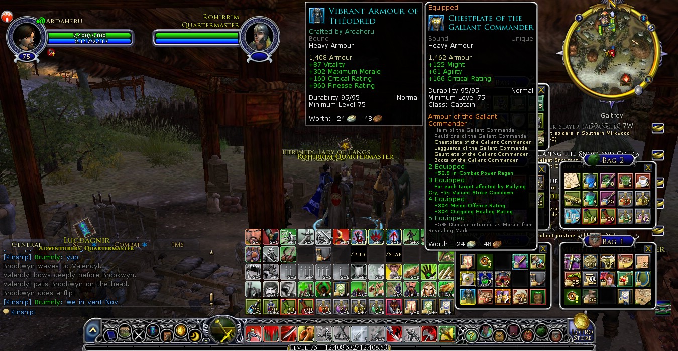 The cooldown for the guild symbols are frustrating indeed. Way before I decided to go s4m happy, I was targeting the crafted armour but no metalsmiths wanted to waste their emblems, even for 5-10 Gold. As for the jewellery, I see a lot of people running around with the guild ones, should be Theodreds’. They look pretty darn good. Since I’m the highest level player in my kin and we don’t have a jeweller that’s kindred with the guild, I use the jewellery that can be bought from the Rep vendors(rohirric and dunlending) at Galtrev, they are pretty decent to be honest, so I’m happy with those for now.