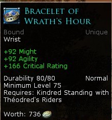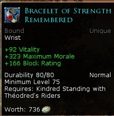 Several excellent pieces of high-quality jewelry are available from the reputation vendors for Theodred’s Riders. They cost more than pretty much anything I have ever purchased from a vendor: 2 gold, 796 silver, and 80 copper. Still, they are solo friendly, non-crafter friendly pieces of jewelry that actually have huge numbers on stats. One bracelet has 92 might and 92 agility!