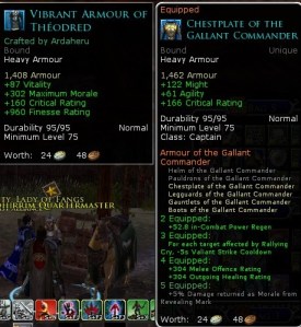 Crafted equipment is actually top-notch as well. For some situations, I will be wearing crafted armor in lieu of the Draigoch set pieces. For instance, for a morale-based build, there is a Theodred’s Riders crafted heavy chest that gives 87 Vitality, 302 morale, and 960 Finesse. The Draigoch chest for Captains gives 122 Might, and no extra morale or Vitality. Obviously, the former will be better for tanking, and the latter will be better for DPS and healing.