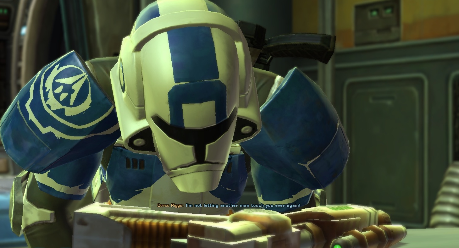 Ah, Corso. I’ve heard a lot of complaints on having him as a companion, and even a romance option. Personally, I thought he was great. First romance option I pursued with my characters, and now I have his legacy perk and Rhyla has a husband. He was a good tank, too, once I realized I hadn’t upgraded a few pieces of his armor in 25 levels…