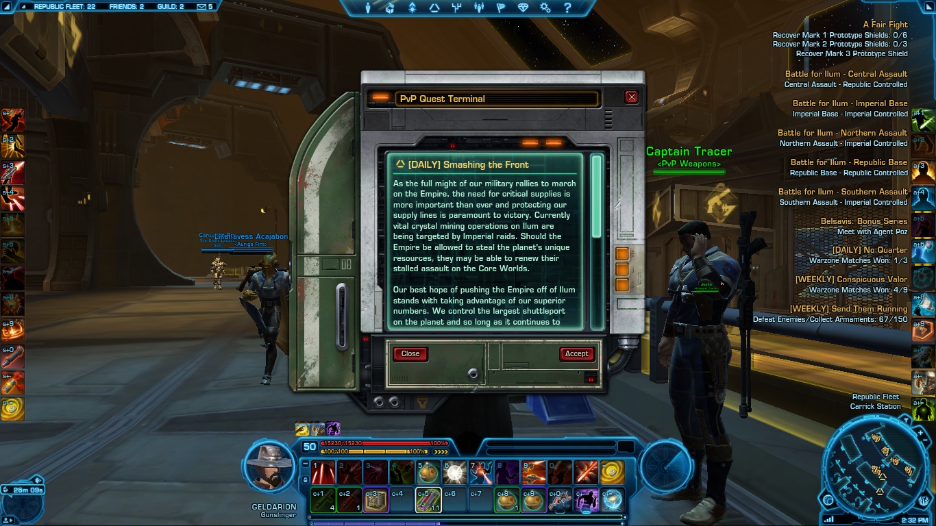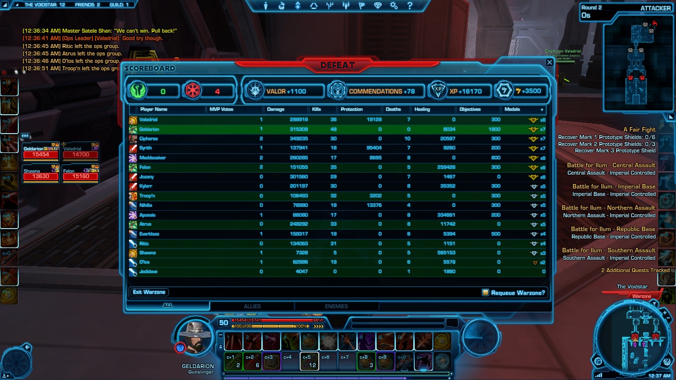 While Bioware can’t balance Ilum quite yet, players have figured out how to. On Lord Praven, we have started Saturday Fight Night, which is where we get together with friends from the Imperial side at Central, and we chat while challenging each other to duels to the death. Healers from both sides rez the fallen, and we learn from each other without the annoyance of running back from the rez. Also, a LOT less lag than with full-on raid vs. raid stuff. No zergs to be seen at all. One thing that should be considered is the Valor buff. The fairest way to do this is to have one side own Central, which is where you are fighting, and the other side owns the other four Assaults. Since the side that owns Central will get a “Defender” Valor buff, the bonuses come out about equal. - Try to pick up an op group on the Fleet